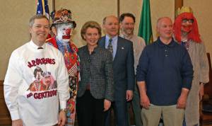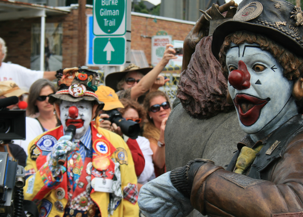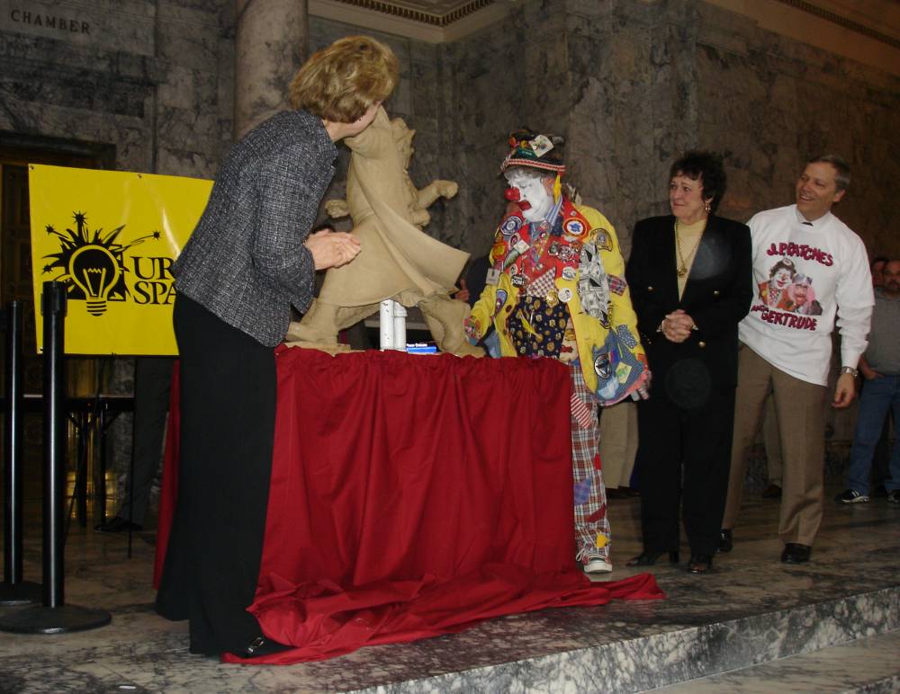 Kids growing up in the Northwest counted on J.P. Patches to put them in the mood for fun each morning before school from 1958 to 1981. Gertrude and all of her/his (Fabulous Bob Newman) alter egos filled the show with guest characters. From 2006 to 2008, J.P.’s (Chris Wedes) carpenter Carl Lovgren and author Bryan Johnston led a team to honor these characters with a bronze statue including a coin bank collecting donations for Children’s Hospital, J.P.’s favorite charity. The statue is in place and $82,000 in excess funds were donated to Children’s.